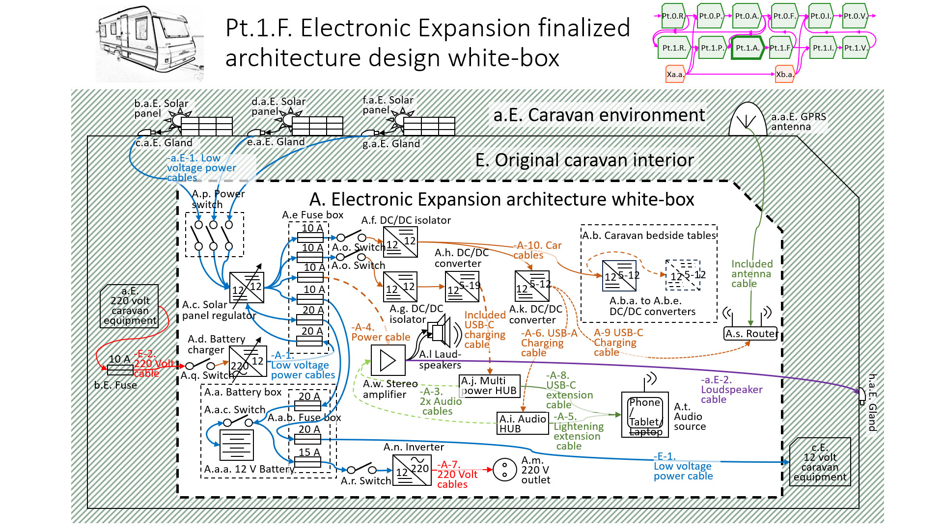 Now one of the most rewarding and exciting step approaches, and that is to open (for design) the black-box, that has been targeted for requirements, and thereafter for trying to satisfy these requirements, with proposed alternative solutions. All chosen solutions are now being connected with each other, to form the white-box design architecture. To open the up the so far hidden black-box, use to appeal to practical engineers, who has for long been forced to apply much theoretical and abstract thinking. But a warning, don't attract to open a premature black-box earlier than now. There is a lot to say about architectures, and specially for this bottom level detailed one. As for the "Electronic expansion" I now develop for the caravan, a lot of electronics and cables are needed, see the design architecture. |