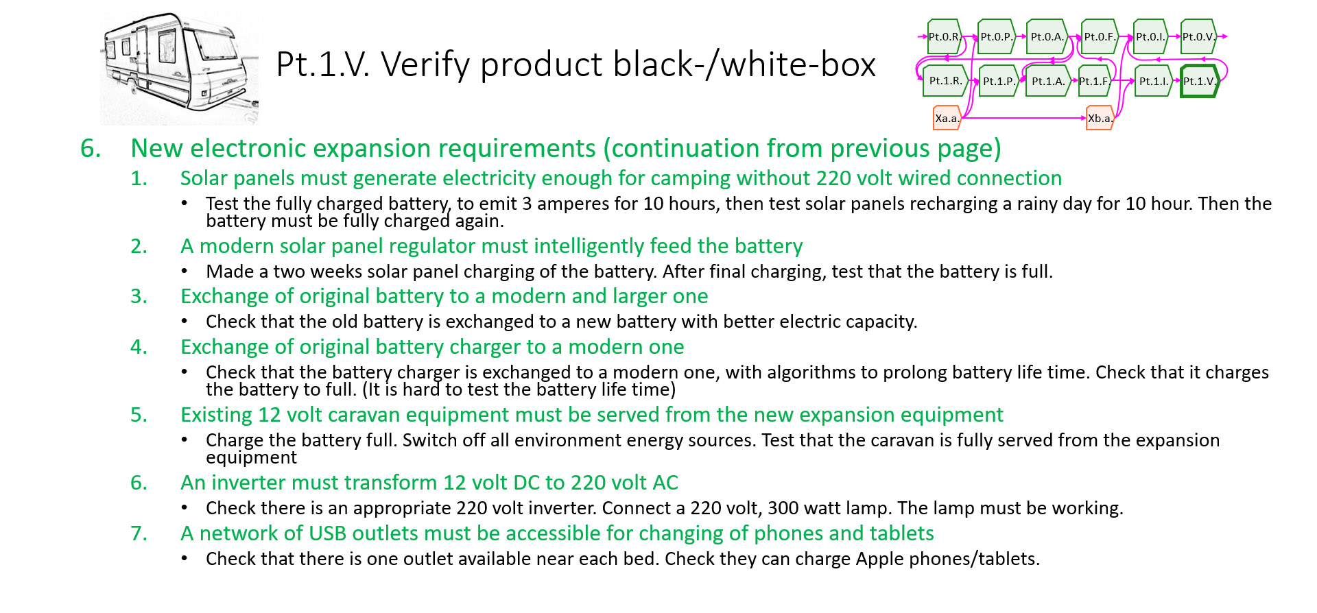 In last blog #34a, I used environment restrictions, see blog #23 Refine requirements from restrictions for the electronic expansion, as the foundation for verification. In this blog I will use the new requirements on the electronic expansion, identified in blog #24 Capture new requirements for the electronic expansion. These requirements are used exactly in the same way as the requirements refined from the environment restrictions. That is, to each requirement, add a description how to verify that the requirement is fulfilled, and can be passed for verifying next requirement. |